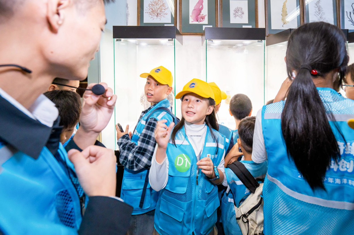 中国科学院海洋生物标本馆讲解标本 “在这里,在这里,我找到了”,在中国科学院海洋生物标本馆里,一位学员指着“童鱼”标本高兴地叫了起来。这座标本馆成立于1950年,是我国规模最大的综合性海洋生物标本馆,采集范围覆盖中国海域及极地、深海等区域,是海洋科学学习的一个生物宝库。在标本馆,数十位学员听着标本馆讲解员的介绍,带着学到的标本知识,在各个展柜里寻找着自己感兴趣的标本,并认真地拍摄照片,做好记录。同时,学员们也了解到这些珍贵的标本来之不易,科学探索不仅要丰富的知识,也需要克服苦难的精神。
