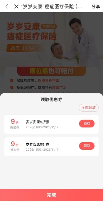 “不同的‘玩法’,反映了不同平台触达用户的策略差异。‘积分权益’重在‘留存’和提升用户黏性,‘引流型’重在‘拉新’和降低决策门槛。”一位资深保险从业者分析指出,“而‘核心直惠型’则更侧重于‘转化’。头部险企通过在自营平台对核心产品提供直接折扣,能有效锁定那些已有保障意识、处于高意向决策阶段的客户,用更直给的优惠换取更高的成交转化率和长期的客户黏性。” 中国人保的“实践”:“务实折扣”承接“刚性需求”在对比了几个平台的活动后,武女士觉得“核心直惠型”更符合她的需求。 想到自己在中国人保的医疗险即将到期,武女士就在中国人保APP上,为百万医疗险进行一键续保,直接享受了9折的优惠。同时,她发现一直惦记给父母配置的防癌险,也可以使用9折折扣券。明确的优惠和便捷的投保流程,让她很快下定了决心,趁着活动窗口期,为父母投保了防癌险,解决了心头大石。